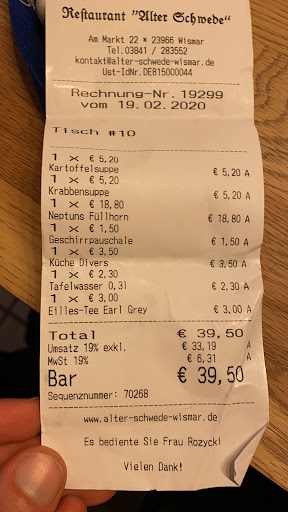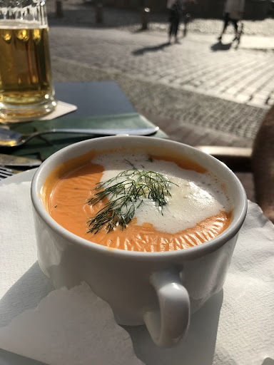 Great restaurant in the center of Wismar. Very friendly staff. The starter was excellent and the soup was fantastic. As the main thief I recommend three kinds of fish served either on dry or with three sauces, I recommend here to dry. Everything is great, so you will be full of food after the meal, but I still love to have a dessert. Well, and that was great as both the pancake and the "whipped hill" were very dense and big, so I could not eat them all but it was worth it. For the whole dinner of one starter of two soups, two main courses, two starters and a few beers, I paid $ 90, which I think will quite go away. I can only recommend this restaurant for anything bad I did not find here, just during the day I recommend you sit outside because it is tough inside but otherwise...