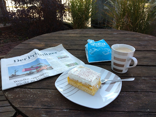 Der Kuchen und der Kaffee waren lecker und frisch zubereitet. Die Verkäuferin war freundlich, kompetent und so wie man sich eine Bäckerei Fachverkäuferin halt vorstellt auch Gesprächig und schlagfertig 😅. Schade war das man nur draußen sitzen durfte aber das ist Corona geschuldet, da der Verkaufsraum sehr klein ist. Da schönes Wetter war konnte man die Terrasse auch genießen auch wenn ruhig in neue Sitzgelegenheiten investiert werden kann.. Die Straße hat man kaum mit bekommen, alles zusammen ganz schön für ein Käffchen und ein Stück Kuchen...