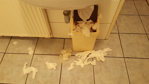 Da die Tische offensichtlich an diesem Tag weder gereinigt noch desinfiziert wurden, konnte man gut nachvollziehen, welche Gäste Remouladensoße, Ketchup und Majo zu ihren Speisen hatten. Aber gut, wir hatten Hunger. Nachdem einige Zeit vergangen war und der bei der Bestellung bekommene Piepser sich noch nicht gerührt hatte, gingen wir zur Theke um mal nachzufragen, wo es denn so hängt. Wie sich herausstellte, stand unser gesamtes Essen dort herum. Die Vorspeise inklusive der der Hauptspeisen. Machte aber nichts, denn in der Zwischenzeit war ohnehin alles lauwarm. Lange Rede kurzer Sinn, meine Scholle war wohl die älteste, die ich in meinem Leben bisher gegessen, oder besser gesagt, nicht gegessen habe. Wenigstens das Jever aus der Flasche war in Ordnung, daher der eine Stern. Zum Abschluss ging ich dann noch auf die Toilette, was dem ganzen das Sahnehäubchen aufsetzte. Siehe Foto. Alles in allem, nie wieder! Neptun sei Dank hat die Küstenräucherei Albrecht in diesem Jahr...