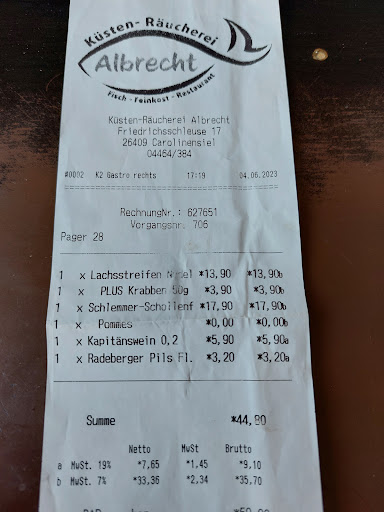 Read moreAn einem der schönsten und ruhigsten Flecken dieses Landes, eingebettet in eine Atmosphäre nahezu meditativer Kontemplation, erhebt sich die Küsten-Räucherei Albrecht als kulinarisches Juwel, das die Sinne in einen Zustand wohltuender Entspannung versetzt. Dieser Ort der Einkehr und geschmacklichen Ekstase lädt dazu ein, die Hektik des Alltags hinter sich zu lassen und in einem Ambiente von unvergleichlicher Idylle die Kunst des Räucherns in ihrer vollendeten Form zu genießen.