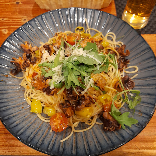 Der Grund weshalb ich nur vier Sterne gebe liegt hauptsächlich beim Essen. Die Bandbudeln in Trüffelsahnesoße und mit Garnelen waren sehr ansprechend, nur leider fehlte mir der Trüffel ein wenig. Die Garnelen leider zu lange gebraten und in der Schale gelassen und durch das lange braten, löste sich die Schale nur sehr schwer. Das sah natürlich gut aus, die Garnelen als Deko in der Schale zu lassen. Es war nur schwierig zu essen, da ein paar Beine der Garnelen auch seinen Weg in die Pasta fand... Leider wurde kein extra Teller für die Schalen gereicht sodass alles am Ende auf einer Serviette auf dem Tisch lag, was nicht besonders appetitlich war.