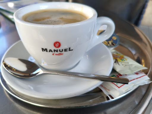 Zwar kann man draußen auf der Terrasse unter und außerhalb eines Säulenganges sitzen; das Vergnügen ist jedoch bei höherem Verkehrsaufkommen auf der benachbarten Durchgangsstraße zweifelhaft. Natürlich kann der Besitzer des Cafés nur sehr eingeschränkt etwas für diesen Umstand.