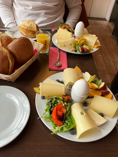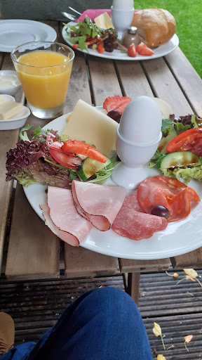 Zu allererst: Die Inhaber (oder Mitarbeitenden?) waren sehr freundlich, da es sehr voll war, dauerte es aber echt lang, Ehe die Getränke kamen oder der Osaft, der zum Frühstück gehörte. Das Ambiente ist ausbaufähig, der Raum war sehr voll, man kam kaum zum Tisch durch. Die Wände sind karg und alles hatte eher etwas provisorisches an sich. Das Frühstück war ebenfalls sehr übersichtlich- Brötchen, Eier, ein Teller mit Tomaten-Mozzarella, Schälchen mit Konfitüre und Oliven, ein Teller mit Käse und Aufschnittwurst, Lachs. Obst gab es ungeschnitten auf einer Etagere. Alles in allem sehr sehr freundliche Leute, aber kein gemütliches Ambiente zum Frühstücken und auch die Auswahl der Speisen, war wie beschrieben etwas mau. Beim Blick durchs Fenster: Der Hof sah sehr einladend aus- in der wärmeren Jahreszeit sicher ein schöner Platz, der auch die Enge bei vielen Leuten...