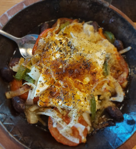 Es gibt ein vegetarisches Gericht als "große" Hauptspeise mit verschiedenem Gemüse. Ich habe mir den überbackenen Fetakäse ausgesucht und dazu ein Pita.