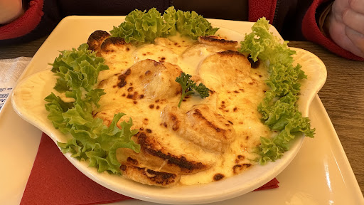 Das Restaurant ist nur bedingt zu empfehlen. Wir waren mit 2 kleinen Familien spontan zum Mittagessen vor Ort. Die bisherigen, eigentlich guten Bewertungen haben uns zum Besuch bewogen. Die Inneneinrichtung ist soweit gut, man kann sich wohlfühlen. Hier gibt es nicht viel zu meckern. Allerdings sind Service und Essen eher gewöhnungsbedürftig. Wir haben sechs verschiedene Gerichte bestellt und waren nur bedingt zufrieden. Als Vorspeise gab es zwei Suppen. Sowohl die Zwiebel- als auch die Tomatensuppe waren nicht gut. Wir hatten das Gefühl, dass hier Fertigprodukte, wenn auch anteilig, verwendet wurden. Die Tomatensuppe ging zurück und wurde auch nicht berechnet. Vielen Dank dafür. Der Beilagensalat war soweit frisch, das Dressing machte auch den Eindruck eines Fertigdressings. Das Essen wurde ordentlich präsentiert. Da kann man nicht meckern. Doe Pommes und Schnitzel machten den Eindruck, dass das Frittierfett oder - öl nicht unbedingt frisch war. Das Schnitzel war auch auf Nachfrage erneut sehr dunkelbraun und die Pommes lasch. Die Saucen waren sehr stark eingedeckt, auch hier nicht unbedingt ohne Fertigprodultanteil. Kurzum, das Essen sieht gut aus, schmeckt aber nur ok. Der Service war soweit ok, obwohl der Kellner einen wenig interessierten Eindruck machte. Ein...