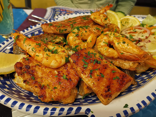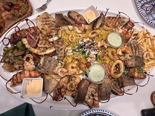 Die Fischplatte war ebenfalls hervorragend, Schwertfisch, Lachs, Thunfisch, Octopus, Shrimps...perfekt gegrillt, unterschiedlich aber in jedem Fall sehr schmackhaft gegrillt - viel besser geht's nicht. Das Gemüse war ebenfalls sehr schön gewürzt und auf den Punkt gegart, der Reis wunderbar aromatisch. Die Portionsgröße würde ich als großzügig bezeichnen - mehr als reichlich Fisch, weniger reichliche Beilagen. Dazu gab's nochbZitronenspalten und zweierlei Soßen. Die Platte ist mit 60€ kein Schnäppchen, aber ich habe so guten Fisch bisher nur direkt am Meer genossen, Preis/Leistung passt absolut.