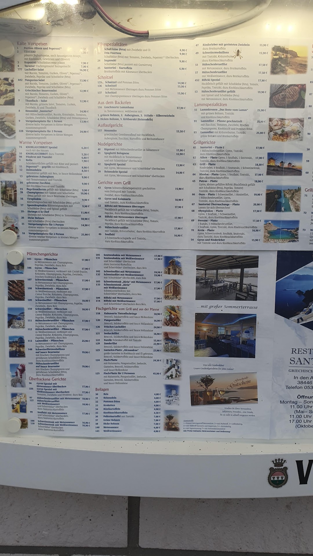 Read moreHeute war ich mit meiner Frau im SANTORINI essen. Auf Empfehlung. Ich war sehr enttäuscht. Dass wir eine Weile bis zur Bestellung warten mussten ist okay, der Laden war voll und das Personal hatte viel zu tun. Leider bekamen wir dann aber mehrfach irgendwelche Speisen, auch Salate, die zu anderen Gästen gehören. Irgendwann kam dann unser Essen, naja, fast. Mir haben sie ein falsches Gericht zubereitet. Wenn man mich gefragt hätte, ob ich das zu einem günstigeren Preis trotzdem nehme, hätte ich wahrscheinlich zugestimmt, da aber ständig etwas angeliefert wurde, was für andere Gäste bestimmt war, habe ich das nicht von mir aus angeboten. Als meine Frau mit dem Essen fertig war, wurde mir mein richtiges Essen gebracht, was ich jedoch zurückgehen ließ, mit dem Worten: "Meine Frau ist fertig mit essen, ich möchte jetzt bezahlen, aber bitte ohne mein Gericht." Die Bedienung ging mit meinem Essen wieder fort. Nach einer Weile kam jemand anderes, wahrscheinlich der Chef, mit der Rechnung. Er stellte mir mein Gericht eingepackt auf den Tisch, mit den Worten: "Das geht aufs Haus." Eine nette Geste der Entschuldigung, wie ich finde. Meine Frau bestätigte, dass Ihr Fleisch hervorragend war, alle Beilagen nicht so sehr. Ich habe mein Gericht dann daheim noch gegessen und möchte bestätigen. Das Rinderfilet war erstklassig. Als Beilage sollten es Bratkartoffeln sein, ich sagte bei der Bestellung, dass sie bitte scharf angebraten sein sollen. Sorry, ich bin nicht sicher wie diese Kartoffeln gegart wurden, aber Bratkartoffeln waren das nicht. Diese Kartoffeln haben nie eine Pfanne gesehen. Das waren nichtmal schlechte Bratkartoffeln, das waren gar keine Bratkartoffeln. Lediglich irgendwie gegarte Kartoffelscheiben. Alles in allem: Die Kartoffeln sollen nicht das Problem gewesen sein, das wäre eine Erfahrung, dass sie Bratkartoffen halt nicht können, die Speisekarte bietet ja viel mehr. Aber mein Gesamturteil... Der Laden sieht...