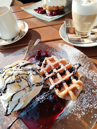 Waren eben dort. Haben draußen gesessen (bei Sonnenschein), innen sehr schönes Ambiente. 2 haben Windbeutel bestellt. Die Sahne zerlief schon beim Servieren. Ein Windbeutel schmeckte lecker und frisch, der andere war hart und alt. Ich hatte eine belgische Waffel. Auch bei mir hielt sich die Sahne nicht lang fest. Waffel war sehr hart!!!, total kross. Hatte noch eine sehr! kristalline Kugel Vanilleeis dazu. War vielleicht vom letzten Sommer? Irgendwann kam eine Bedingung und fragte, ob es geschmeckt hat? Als wir verneinten und ich mich über die Waffel beschwert hab (zumal die 2, die am Nebentisch serviert wurden, ganz hell und fluffig aussahen), gab sie kleinlaut zu, dass es wohl eine ältere Waffel war. 😕 Und die TK Waffeln kommen immer auf den Grill. Nun ja... Wir sagten ihr, dass wir bezahlen möchten. Das sagte sie dem Kellner, der uns die Speisen gebracht hatte. Dieser Kellner kassierte dann erstmal demonstrativ andere Tische ab, die nach uns Bescheid gesagt hatten. Beim Abkassieren erzählte er uns dann pickiert, dass ja ALLES ganz frisch gewesen wäre und die Sahne schließlich aus dem Syphon kam, aber wohl nicht geschüttelt wurde. Ausserdem wären wir ja wohl die Ersten, die sich überhaupt beschwert hätten.