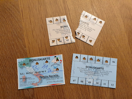 Wir hatten 5 Pizzen bestellt. Eine Pizza war unvollständig belegt. Beim Holen legte der Abholer zwei Bonuskarten vor, von denen eine voll war und 6 Euro Rabatt versprochen war. Anstelle die Karten einzulösen, habe der Verkäufer die Karte einfach zerrissen und in unfreundlich schnorrigem Ton angegeben, diese nicht mehr einzulösen, da sie schon "alt" wäre. Die zweite, angefangene (und auch fast volle) Karte ließ er ganz, so dass wir uns später nochmal vergewissern konnten, dass nirgendwo ein Ausstellungsdatum oder eine Gültigkeitsdauer zu ersehen war. Laut Verkäufer löst er nur noch Karten ein, wenn diese innerhalb von 3 Monaten voll sind (steht jetzt auf den neuen Karten auch so drauf). Schade, dass man Kunden so verprellt, denn wir haben dort auch viele male Pizza und anderes gekauft, ohne eine Bonuskarte vorzulegen, weil wir sie schlicht daheim vergessen hatten... Na ja, wir kaufen unsere Pizzen natürlich auch gerne ohne einen Bonus - künftig aber woanders, denn mal ganz unabhängig von dem kundenunfreundlichen Erlebnis: die Pizza war geschmacklich auch nicht mehr das, was sie mal war. Da hilft dann auch...