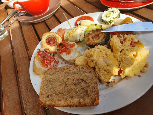 Vorsichtshalber hatten wir vorher angerufen und gefragt ob noch Plätze frei sind und wir hatten Glück. Ab zehn Uhr kann man hier frühstücken und es waren auch noch drei Plätze frei.