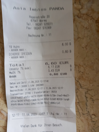 Juli 2021 Peking Imbiss hat tragischerweise Betriebsurlaub. Gericht mit Gemüse, Glasnudeln und Nudeln bei Panda bestellt. Eigene Abholung. Gericht kostet mit Reis 6,50 Euro, mit Nudeln 1,50 Euro ohne Info am Telefon. Stimmung bereits unterdurchschnittlich. Folie abgezogen. Glück gehabt, keine Fliege. Gericht probiert, gebratene Nudeln schmecken nach altem Fett und Eisenpfanne, Gemüse mit Glasnudeln vollkommen geschmacklos. Vermuten das der Koch vorher im Altenheim gearbeitet hat.