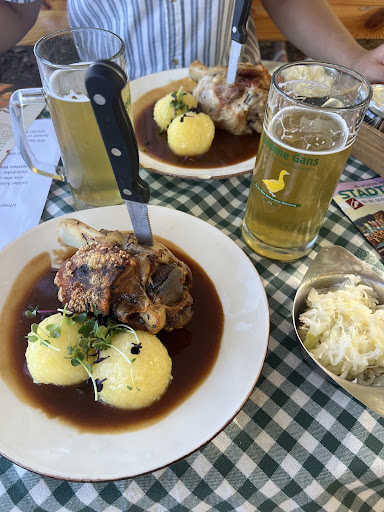 Read moreDie ‚Goldene Gans‘ macht ihren Namen mal alle Ehre! Soviel Biergärten Nähe der Alten Mainbrücke gibt es nicht. Somit bietet der Biergarten nicht nur einen super Ausblick auf das Mainufer, auch das Treiben an der Schleuse und auf dem Main kann bestaunt werden. Der Garten ist durch Sonnenschirme flächendeckend beschattet, deshalb ist es hier auch bei über 30 Grad möglich lange zu verweilen, Kraft zu tanken. Anstatt Kies befindet sich hier Rindenmulch am Boden. Dies ist nicht nur staubfreier, sondern viel angenehmeres Gefühl beim gehen. Bierbankgarnituren inklusive Rückenlehne. Für die Kleinsten gibt es ein Riesentrampolin, sowie einen Sandkasten. Das hier der Gast ganz ganz wichtig ist merkt man auch beim Empfang durch das Personal am Eingang. Freundlich & Zuvorkommend, Hilfe bei der Platzwahl. Die Traditionelle Tracht, gestaltet in weiß/grün, runden für mein Auge den Garten perfekt ab. Sonntags vor Abreise mussten es unbedingt noch fränkische Bratwürste mit Kartoffelsalat sein. Super gebraten waren die Würste, die Dunkelbiersoße könnte meiner Meinung nach weltweit das Ketchup zu den Würsten ersetzen (& Senf), der Kartoffelsalat war in jedem Aspekt perfekt! Das eigene, naturtrübe Bier war einfach nur herrlich im Geschmack! Schön süffig, kein herbes Bier, passt mit bestimmt zu jedem angebotenen Mahl aus dieser Küche. War ein spontaner Besuch vor Abreise, schade das ich nicht noch mehr Zeit hatte. Immer wieder...
