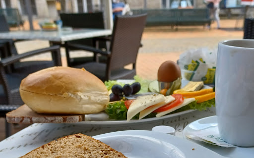 Die mich bedienende Mitarbeiterin nahm ich als ausgesprochen angenehm wahr: freundlich und darüberhinaus sehr hilfsbereit, indem sie mir "Rollator-Else" 😄 den Kaffee und das ausgewählte sehr späte (nach 12 Uhr)- Frühstück an meinen Tisch im Aussenbreich des Cafés brachte- obwohl derzeit (Corona-bedingt?) ansich Selbstbedienung + selbst die Tische abräumen gilt.
