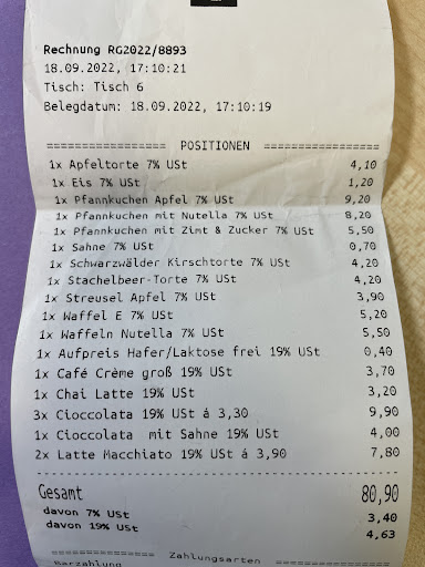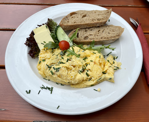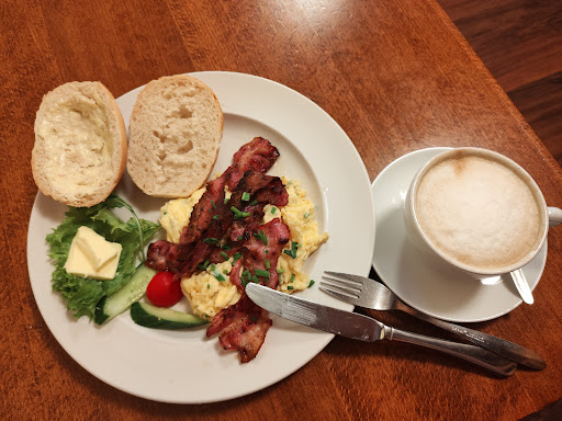 Hab mir Rührei mit Speck bestellt und ein Pflaumen Kuchen, mit Milchkaffee. Der Milchkaffee hatte eine Feste Schaumschicht die nicht nach einigen Minuten sich aufgelöst hat.