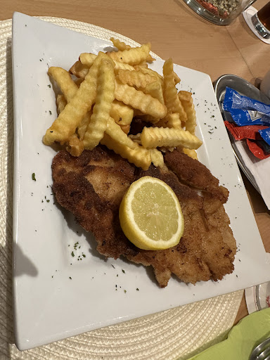 Unser Schnitzel wurde handgeklopft ! Und es war lecker! Wir kommen wieder, natürlich mit unseren Freunden ! Ich muss noch dazu sagen, dass hier ebenfalls griechisch gegessen...