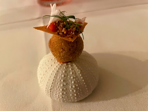 Der Gruß aus der Küche entführte uns auf eine exquisite Geschmacksreise mit einem Dreiklang aus Cervice, einer noch leicht warmen Serrano Praline und einem super cremigen Kürbistartlett, von denen jedes für sich genommen ein kleines Meisterwerk war. Obwohl der Cerviche hinter den anderen beiden an Spannung leicht zurückblieb, setzte der folgende weihnachtliche Gruß mit Entenkeule, Rotkohl, Sellerie und gehobelter Marone erneut hohe Maßstäbe.