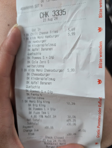 Read moreDiese Filiale verdient eine Auszeichnung und zwar als teuerste Burger King Filiale deutschlands. Alle Preise sind wesentlich höher als in regulären Filialen. Der günstige Bürger ist der Hamburger, dieser kostet hier 2,99€. 1 Cheeseburger kostet stolze 40 Cent mehr (weil dort 1 zusätzliche Scheibe Käse drauf ist). Ein einzelner Wopper kostet über 8€. Die einzigen Gutscheine die hier Akzeptiert werden, sind die von SANIFAIR. Dadurch kann pro Toilettengang bei SANIFAIR, bei jeder Burger King Bestellung 1€ gespart werden. Der Grund dafür das hier keine Gutscheine angenommen werden ist, dass es sich bei Burger King Filialen um "Franchise-Unternehmen" handelt, die Privatpersonen gehören. Dadurch kann jede Inhaber selbst bestimmen ob er Gutscheine akzeptiert oder nicht. In dieser Filiale können weder Kronen (Punke) über das "MyBurgerKing" Programm gesammelt werden, noch kann man einen "King des Monats" bestellen. Leider gibt es keine Aufschrift, die drauf hinweist, dass keine Gutscheine akzeptiert werden. So sieht stehen die Kunden erstmal verwundert vor den Bestellterminals und suchen nach den gewohnten Schaltflächen. Einige der Mitarbeiter wirkten genervt (vermutlich weil es häufig Beschwerden über die nicht akzeptieren Gutscheine gibt). Das Essen war okay. Draußen gibt es einen Spielplatz für Kinder. Seltsam war, dass die Filiale, bei Google Maps nicht auf der Karte angezeigt worden ist, sondern nur bei einer Suche innerhalb der App angezeigt wurde. Dort stand, dass man +20 Minuten von der Autobahn abfahren müssen um zu der Filiale zu kommen, das stimmt aber nicht, die Filiale ist direkt hinter der Tankstelle. Ich werde diese Filiale zukünftig meiden und mein Glück in einer...