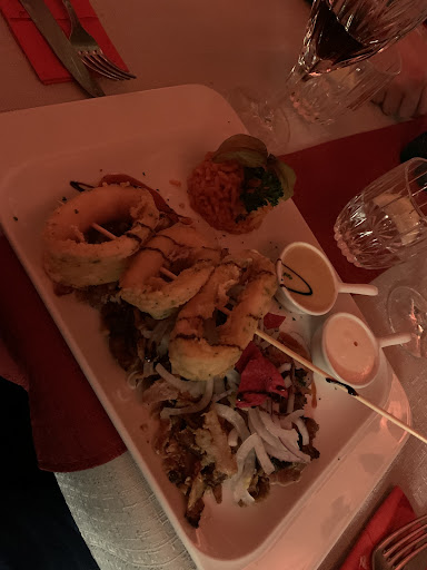 Katastrophaler wurde es als die Hauptmahlzeiten serviert wurden, denn die tendierten fast alle zwischen lauwarm und warm. Die 6 Tintenfischringe für 14 oder 15 Euro waren sehr übersichtlich angerichtet mit (haut mich, ich glaube) Kartoffelstreifen, dafür mit mehreren wässrigen Dips welche, wie bei allen anderen Mahlzeiten, geschmacklich entweder neutral waren oder scheußlich schmeckten. Übertroffen wurde dies allerdings durch die gummiartigen Tintenfischringe welche aufgrund der lauwarmen Serviertemperatur Wünsche offen ließen und auch kaum zu einer annehmbaren Sättigung führten.