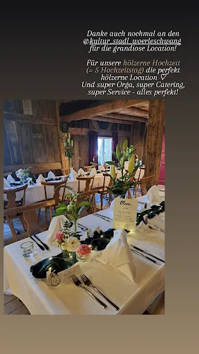 Wir haben unsere hölzerne Hochzeit im Kulturstadl gefeiert und können sagen, dass alles rundum perfekt war! Als ehemalige Eventmanagerin habe ich schon einige Ansprüche... Die Planungen mit Björn liefen reibungslos und die Kommunikation war immer zügig und freundlich sowie konstruktiv - hier ist einfach ein Profi am Werk. Auch Sonderwünsche was das Essen anging, aufgrund von Allergien, wurden geklärt und umgesetzt. Die Technik vor Ort funktionierte auch einwandfrei und wir konnten alles gut selbst, mit Unterstützung des Haustechnikers, steuern (Diashow, Spotify auf Tablet). Cool wäre gewesen, wenn man für die Musik keinen riesigen Klinkenstecker am Handy/Tablet/Laptop bräuchte, sondern sich via Bluetooth verbinden könnte. Aber es letztendlich auch mit dem hauseigenen Tablet funktioniert... Was übrigens top ist, ist das wunderschöne Lichternetz das in der Decke hängt. Dadurch ist die Location nicht nur angenehm ausgeleuchtet, sondern die Atmosphäre schön romantisch. Man muss hier gar nicht viel selbst dekorieren, denn es ist schon ohne Deko wunderbar.