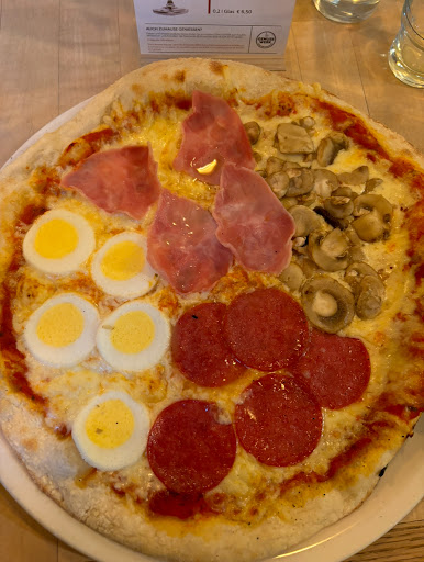 Je vous partage ma pizza, j’ai beaucoup ris en la voyant mais malheureusement en plus de ça elle n’était absolument pas bonne. Très très salé j’y ai à peine touché. Je n’ai jamais vu de ma vie une pizza ou on sépare les ingrédients c’est une première pour moi. Vraiment pas terrible. Ma mère a prit des pâtes au pesto avec tomates cerise, il y avait effectivement une seule petite tomate cerise qui n’avait vraiment pas l’aire savoureuse. Les produits utilisés doivent être vraiment de très mauvaises qualités. Le service est correct. Les wc sont propres. Mais une chose est sur je n’y mettrais...