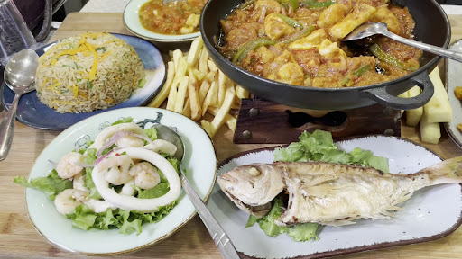 Platter came with two different seafood sauces, potato fries, fried rice, calamari & shrimp salad, fried calamari, fried red fish, sautéed shrimps and fried yam strips.