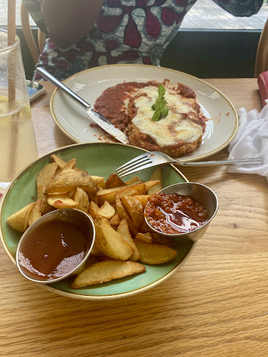 A chicken parmesan was ordered but she was unable to eat it, had lost her appetite. The tomato sauce tasted very processed American like sugar has been added. The wedges were nice