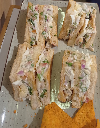 Asked the waitress what she saw, she replied 'egg' but continued to promise that there was chicken. Ate and paid for the questionable 'chicken' sandwich which was delicious but it was 80+% egg, 10% mayonnaise with some morsels of chicken! I'll know not to order this...