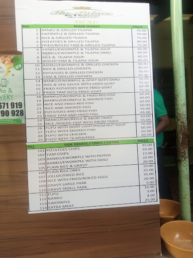 I arrived 8 pm and they still served me (no one else was dining) but they were out of some things They have many of the standard Ghanaian dishes. I had Jolof with chicken. The chicken was juicy, the sauce made the flavor really come out, and the rice was just the right amount of fluffiness and spiciness. reasonable price: GHS 90 for my meal no AC (all outdoor but covered seating) seating furniture...