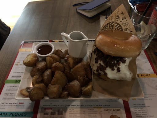Coming from Dublin where burgers are treated like coffee is in Italy, I have been on a never-ending quest for two years to find a burger of such high quality in Barcelona. Today, when I walked into Goiko Grill, this quest finished. The door is manned by a friendly lady who quickly found me a table without any reservation (from observation, this is definitely a place you need to book in advance). The staff are clearly very busy here but never fail to smile and give you the service you need. I was seated in the centre under a dimly glowing light facing the kitchen. This place is very busy but extremely spacious but although it’s full you don’t feel like you’re involved with any tables around you. The music sets the scene by playing upbeat music around the restaurant which is very clean and well kept. The menu has great variety (and contrary to other reviewers there IS a vegan option with NO additional charge) offering you the choice of meat, sides, and then the style of burger. They have a daily special from Monday to Friday consisting of a burger with fries and a drink or dessert for only 11.50€, definitely a great deal. I decided to try the most daunting item on the menu; the Gordonut (I loved the name). This is a limited edition beef burger sandwiched between two glazed donuts (yes, donuts) and filled with pieces of bacon, a fried egg, and melted cheese. A jug of maple syrup accompanies the dish to add all those extra calories working against your beach body. The result is a delicious marriage of sticky & sweet with sharp meaty overtones - basically a damn good burger. The meat is high quality and carefully cooked to perfection. I also read some reviewers criticising the size of the burgers and can say that this is the correct size for a burger - so much so that I was unable to finish the delicately seasoned fries and order a dessert. Having found my burger haven in Barcelona I’ll be quick to return to try their classics which already...