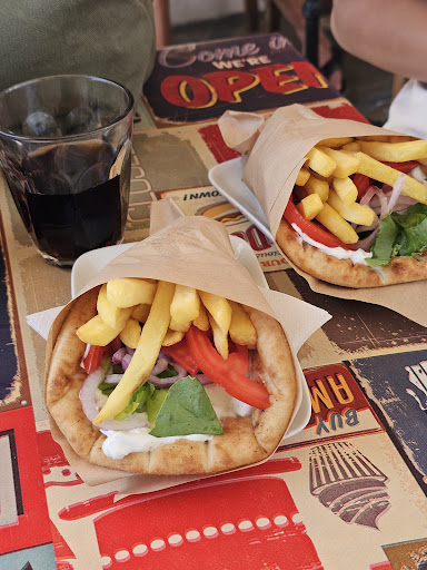 Read moreA gyrosminirestaurant as you want it. 2 sweaty men in the kitchen preparing delicious pitas at a bizarre tempo with high efficiency (I like to look at these men that became machine whilst having fun). The waiter seems very stressed and chaotic but sees everything and doesn't let you bring your plates and trash inside to help him: 'noo no please please sit, i will do it, what can i do for you!', perfect if you ask me. Tsasiki is very good, big slices of juicy tomato, fresh...