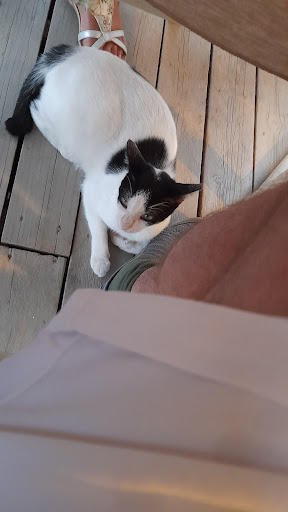 Partner had a delicious mixed slouvaki. The chips are perfect, light & crisp & tasty. A late lunch so cool Mythos rather than wine and the company of a cat and a dog who were glad to be either side of me and count me as no man's land in a truce fo so long as there were scraps. Then, when they could see no more coming they set off in opposite directions.