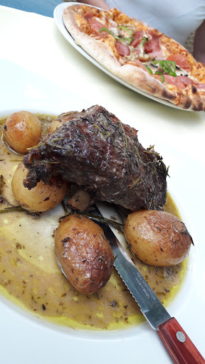 We went for dinner. When we asked if the red wine was cold (which is quite usual in greece), we were told is was chilled - which it wasn't. But they served us ice cubes. Sadly we didn't really like the taste of the house red :( well.. The restaurant is famous for its wood oven pizza. We expected an italien style pizza with a nice thin crust. Ours was dougy without a nice crust :( we also had lamb from the oven with potatoes which was quite cheap and was served in a delicous sauce. In the end the very very good lamb made us leave with an good to okay feeling. The overall service was good but a little "too much" - they aim for a superior service feel but it seemed stiff, almost "pinguey". In greece we enjoy a little more...