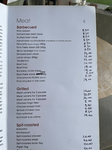 Read moreΑπαίσιο, είναι αστείο να δώσουμε έναν σκασμό λεφτά για πατάτες και σαλάτες. Τα κυρίως άργησαν υπερβολικά, όπως και στα διπλανά τραπέζια. Γυρίσαμε πίσω στην κουζίνα 3 κυρίως, διότι τα δύο μπιφτέκια ήταν καμμένα και το αγριογούρουνο ( ντεμέκ) στιφάδο ήταν τουλάχιστον απαράδεκτο, μέσα σε νεροζούμι και καλά "σάλτσα" με τέσσερα κρεμμύδια, το κρέας μάπα και βέβαια το φαγητό βγήκε από την κατάψυξη, μπήκε στα μικροκύματα και σεβιρίστηκε κρύο! Ήμαρτον! Και 15€!! Όταν το επέστρεψε ο αγενέστατος υπεύθυνος , κυριολεκτικά το σβάρνισε πάνω στο τραπέζι μας. Ευτυχώς που δεν έφεραν τα παϊδάκια (14€!) Μας έφεξε! Δεν θυμάμαι στην Ελλάδα να έχουμε ζήσει άλλη τέτοια τραυματική εμπειρία σε ποιότητα φαγητού, αναντιστοιχία τιμών και συμπεριφορά λιμανιού, λες και φταίγαμε εμείς που δεν τρώμε καμμένα κρέατα και τολμήσαμε μαζί με διπλανό τραπέζι να ρωτήσουμε μετά από μια ώρα για την αργοπορία. Α! Η σαλάτα! 9€ για 3-4 φύλλα πράσινα, 3-4 καρύδια, 3 ντοματίνια, τα οποία δεν ξέραμε πώς να μοιράσουμε... Κοροϊδία! Φτάσαμε στο μαγαζί στις 1:45 μμ και δεν υπήρχαν ήδη και σαλάτες και κυρίως από το μενού! Πήγαμε στο συγκεκριμένο εστιατόριο οδηγώντας μια ώρα για να ευχαριστηθούμε. Τι αποτυχία, τι απογοήτευση! Και εκτός που φύγαμε νηστικοί και αργοπορημένοι, μας μάλωσαν...
