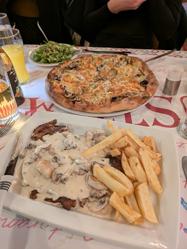 we had a steak with cream sauce and mushrooms and a pizza, as well as a salad (which was delicious, although the ratio of ham and cheese to arugula was approximately 2:1)