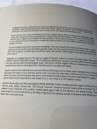 I am in the middle of my dinner and I could not wait to write this review. I am dining by myself at the counter and I have to say the atmosphere is beautiful. I am Greek and I appreciate fine dining and Ateno checks all the boxes. The atmosphere and lighting is subtle and elegant. The service is impeccable…the wine list is world class…and the food is award winning and delicious does not do it justice. I started with the beef tartare pizza and if you like beef tartare do NOT miss this! It is so special and please take advantage of the Sommelier Simeon…he is so knowledgeable and helpful. I had an elegant Xinomavro with the beef tartar pizza and it was PERFECT! For my main, I ordered the Sea Bream with orzo and he suggested a lovely white wine that is flavorful and accompanies the dish perfectly. The Sea Bream dish is award winning and is not to be missed. The flavors are succulent and original. That is why it is award winning. I haven’t had dessert yet, but I know exactly what I’m going to have and it is my favorite ice cream on the planet…cinnamon. I can’t wait. Everyone is so friendly and they treat you like family…such a Greek gift. If you are looking for a fine dining experience that won’t break your bank, come to Athena!!! This is a must visit...