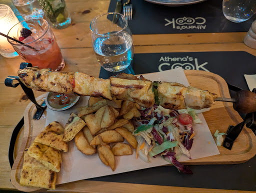 Athena's Cook - One of the best places to grab a delicious meal served by a friendly staff. Thanks to Georgina, our hostess, who gave us her honest opinion and suggested a fantastic dessert! We even went back the following night! Both nights we sat outdoors, the first night our tables were clean as were the utensils properly placed as our server introduced himself. I ordered the special, lamb chops grilled and served over fries. My wife, a vegetarian, ordered the four cheese ravioli with cream sauce and thyme. The lamb chops, I was told, must be eaten with your hands. So included with the meal were some hearty hand wipes. These were the best lamb chops ever, a nice grilled flavor along with just the right amount of salt to make them super delish! They were tender and juicy and perfectly grilled. Not knowing what to order for dessert, our hostess, Georgina was standing near our table so I asked for her honest opinion. Without hesitation, her favorite, the chocolate brownie with vanilla ice cream. We ordered that and the house baklava! Both were a bit-o-heaven here on earth. The brownie was warm, and the ice cream creamy and so good. The baklava was oozing with honey sweetness. Our second night, we walked up to the hostess station and was greeted by Georgina and a friendly wave of recognition. After a few pleasantries and expressing how much we enjoyed the previous night, Georgina sat us at an outdoor table. This time, my wife ordered the linguini with chicken (yes she's a vegetarian, but when in Greece...). I ordered the chicken souvlaki, but not before asking Georgina for her advice once again. She told me what flavors to expect and once again, the choice did not disappoint. The chicken was served on the skewer, hot, juicy, and tender. A nice grilled flavor with a hint of citrus, delish! It came with a sweet and sour sauce, bread, and home style fries, along with a red cabbage salad garnish. For dessert, the choice again was the chocolate brownie with vanilla ice cream. After filling ourselves, we sat, laughed, and enjoyed our evening out. Several of the servers recognized us from the night before and pleasantries were traded between us all Saying goodbye to Georgina, she hoped we would be back soon, but alas, we will not be able to visit Athena's Cook again this trip. We wished her a happy life and said that maybe we'd come back to Greece again soon. If you go, ask for Georgina's recommendation! She's knowledgeable about the food and won't...