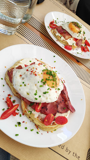 This place has many breakfast and brunch options that include eggs, bacon, and sweet or salty pancakes. They also have alternative/vegetable milks like almond milk and sprout milk. The location is a couple buildings away from the main street allowing for less noise. For outside seating there are covers from the sun and elements with trees and fabric canopies.