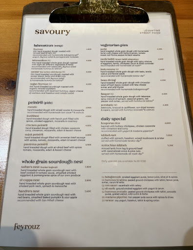 Read more4.5 stars Feyrouz offers a refined take on Levantine street food, serving a bakery case of savory wraps and pides with creative fillings. The Feyrouz Lahmatzun was a wrap made with a soft, thin flatbread topped with minced beef & herbs, along with a filling of Feyrouz Salad (red/white cabbage, lettuce, carrots, peppers, herbs), babaghanoush, and yogurt. The Roostic Peinirli was a boat-shaped pastry with a filling of wined rooster, mozzarella, and onions, topped with homemade sauerkraut. My favorite item was the Surki, a boat-shaped pie made with a whole wheat dough, containing a sweet, salty, spicy filling of Syrian soft cheese mixed with tomatoes, peppers, herbs, and spices, sprinkled with black sesame on top. Overall, the wraps and pastries here were all decent though they were all reheated and would have been better fresh. Finally, we had the Mixed Salad, which came with both the Colorful Feyrouz Salad and Antiochian Tabbouleh (couscous mixed with herbs), topped with a dollop each of babaghanoush and yogurt, making for a nice...
