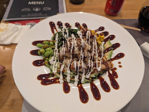 We were in Athens for 10 days and 5 of those days we went to eat here, just because the food was so good. Everything was delicious. The service was also excellent too. I highly recommend this place. We even got free Dessert and when asked for more we got more without any questions. We could even take it with us to our hotel to enjoy further. When we ever come back in Athens they will see us again! The menu is very nice and you can ask them to change anything you like, something im not used to in my own country. If you like Japanese or Chinese food this is the place to be! They even have Japanese and Chinese sake seen in the picture where they have lit up the sake to slightly cook our Salmon on the spot. We really loved this! The salads are great! The soups are good, prices are very reasonable, if you like this kind of food, this place will make you love it more i know I've mentioned it before but we really liked it a-lot. I never write reviews this is my first review ever made i really wanted to support this place. They even taught us how to make our own rolls when we showed intrest in how to make it.