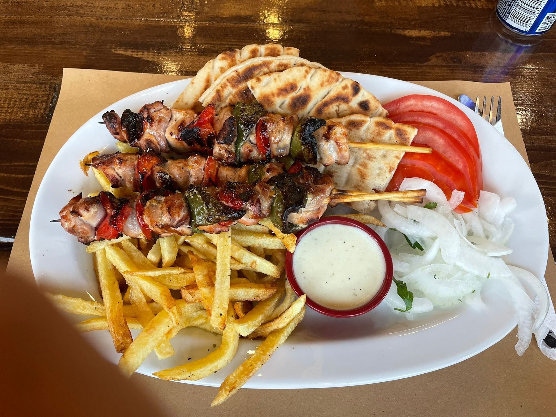Φάγαμε μία μερίδα σουβλάκι κοτόπουλο, το οποίο σερβίρεται με μία ωραία σως από πάνω που δεν το έχω ξαναδεί κάπου. Σερβίρεται κλασικά με πατάτες, ντοματούλα, πίτες και κρεμμυδάκια. Οι πατάτες φρέσκιες, η πίτα νόστιμη, το σουβλάκι κοτόπουλο ζουμερό με πιπεριές διαφόρων χρωμάτων και η σαλάτα φρέσκια.