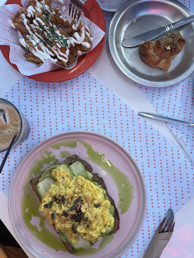 Read moreA cute spot in Athens with nice decor and a somewhat friendly staff. We ordered sweet potatoes, avocado toast, a dish with fried eggs, coffee, babka, and a Basque cheesecake. We were surprised to find that most options were vegetarian, though this wasn’t clearly advertised. The menu lacked variety, and the avocado toast was underwhelming—the bread wasn’t crunchy at all. However, the Basque cheesecake was outstanding! Overall, it seems like a better place for coffee and dessert rather than a full...