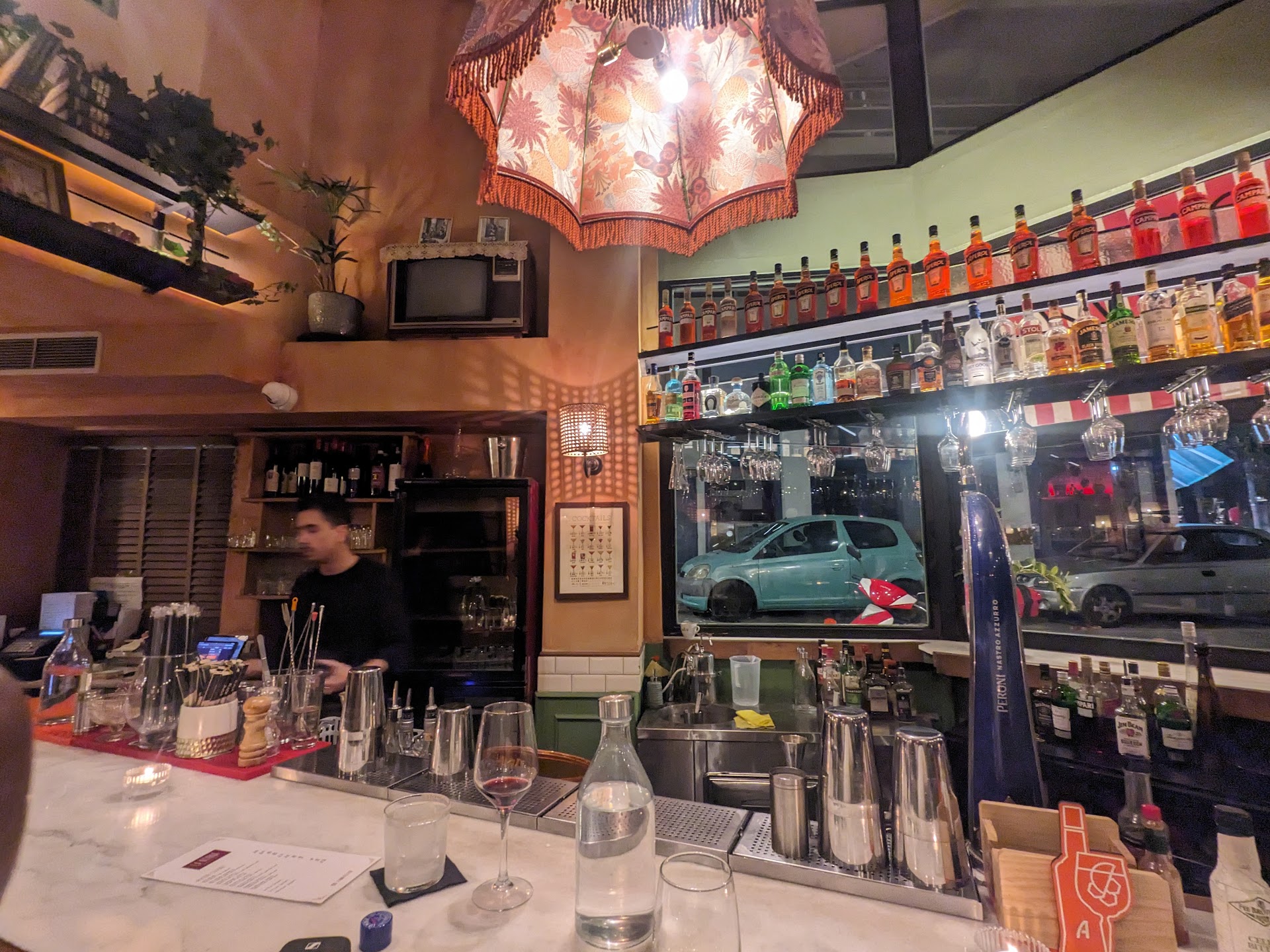The space is super welcoming: it has that Mediterranean, checkered garden table feel. It is lit mainly with draped/checkered lamps, which gives a speakeasy romantic kind of vibe, so a bit of romantic and edgy at the same time. The music is soothing and not overbearing. I love their choice of colors too: a mix of salmon, red, white, and brown. I very much enjoyed spending time at their bar the first time: I found it elegant with an edge. The people working here are very thoughtful. I'd say that this is a great place both for couples, friends looking to catch up, families, and other occasions.