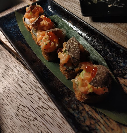 We had spicy edamame (which was soooo salty (we genuinely had to stop eating it) but thanks to another waiter and chef, the brought out another and recovered the experience. The beef tataki soba salad was delicious, the flavour and different textures of ingredients in the dish was š¤š½. Sea bass and peas dumplings also very nice. We then had ebi tuna sushi rolls and creamy sea bass nigiri which was very good. We like our sushi and the food was of very good standard and quality. We wanted to try the mains (although no black cod š¢) but sadly weāre too full!