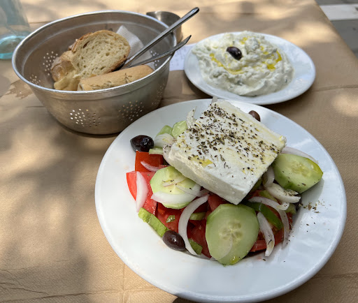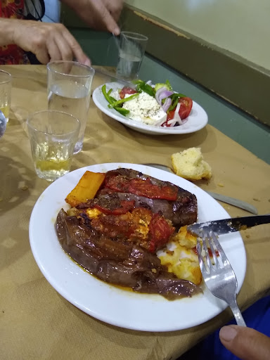 Great food, an optional English language menu, big portions, and low prices. One our first visit, we ate what the waiter suggested, and really enjoyed it. That was stuffed peppers and tomatoes and meat stuffed zucchini (corvettes). Since then we have tried many dishes and they have all be very good and plentiful. Definitely a local place, far removed in atmosphere from the touristy places, which is what we are looking for. Highly recommend. A note on the service, since there are a few reviews that aren't completely positive. The waiter leaves you alone to relax and enjoy your company and conversation. Greeks expect to spend a long time at their meal and socializing and expect not to be rushed. The staff is available if you need anything, but aren't asking you every minute if you need something, which is nice. You can sit as long as you want with no pressure to order, eat, and leave. And they speak much more English than I speak Greek, and since we are in Greece, I appreciate that they have gone out of their way to have an English menu and to speak English at all. Great meal and experience, at bargain prices.