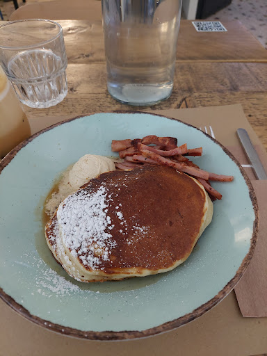 Then my food arrives. I got the maple pancakes with bacon and a cappuccino freddo with sugar. The theme of this meal and be summarised in two words: bitter and salty. The coffee didn't seem to have sugar in it, and still tasted kind of bad with the sugar syrup I had to ask for. The pancakes had a tiny bit of maple syrup, and you have to pay for a reasonable amount. The photo shows three pancakes: only got two. The bacon and pancakes taste a little odd, and the whipped butter (I think) tastes bitter and salty.