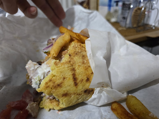 Read moreWe got chicken (pictured) and pork portions. Around 10€ each for 400gr of meat (!!!) + pita + a bit of fries and salad + sauce. The food was amazing to say the least. Meat perfectly spiced, pita delightfully seasoned. And there's no way these portions are for one person only lol.