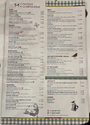 Tzitzikas kai Mermigas has a curious name meaning “the Cricket and the Ant” (after Aesop’s Fable), and one look inside will reveal that this restaurant has a modern art theme and serves creative, beautifully-presented plates of food! Upon sitting down, we were started with a complementary plate of olives and an aperitif of tsipouro, a strong Greek brandy. For an appetizer, the Trilogy of Dips included tzatziki, whipped feta, and smoked eggplant with peppers/walnuts, along with pita chips on the side. Next, the Tzitzikas Salad was a colorful mixture of 10 different vegetables (lettuce, arugula, tomatoes, cucumbers, red bell pepper, red cabbage, green cabbage, carrots, jicama, radish) topped with a mustard vinaigrette dressing, and served with chunks of salty anthotiro cheese and crumbly manouri cheese. For our mains, the Squid on the Grill was a whole grilled squid served with a jet-black puree of fava beans mixed with cuttlefish ink! We also had a special dish of the day, the Grilled Rooster Meatballs, which were served over tomato sauce, along with a feta cheese dip and fried potatoes on the side. The rooster meatballs had a distinct meaty flavor and aroma from the spice mixture, and they paired nicely with the flavors of the tomato and feta. Everything we had was flavorful and delicious, and the highlights for me included the squid ink fava bean puree and the rooster meatballs. The creative food presentation was a step above, and the service was super...