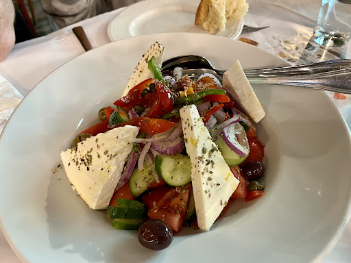 Tzitzikas kai Mermigas has a curious name meaning “the Cricket and the Ant” (after Aesop’s Fable), and one look inside will reveal that this restaurant has a modern art theme and serves creative, beautifully-presented plates of food! Upon sitting down, we were started with a complementary plate of olives and an aperitif of tsipouro, a strong Greek brandy. For an appetizer, the Trilogy of Dips included tzatziki, whipped feta, and smoked eggplant with peppers/walnuts, along with pita chips on the side. Next, the Tzitzikas Salad was a colorful mixture of 10 different vegetables (lettuce, arugula, tomatoes, cucumbers, red bell pepper, red cabbage, green cabbage, carrots, jicama, radish) topped with a mustard vinaigrette dressing, and served with chunks of salty anthotiro cheese and crumbly manouri cheese. For our mains, the Squid on the Grill was a whole grilled squid served with a jet-black puree of fava beans mixed with cuttlefish ink! We also had a special dish of the day, the Grilled Rooster Meatballs, which were served over tomato sauce, along with a feta cheese dip and fried potatoes on the side. The rooster meatballs had a distinct meaty flavor and aroma from the spice mixture, and they paired nicely with the flavors of the tomato and feta. Everything we had was flavorful and delicious, and the highlights for me included the squid ink fava bean puree and the rooster meatballs. The creative food presentation was a step above, and the service was super...