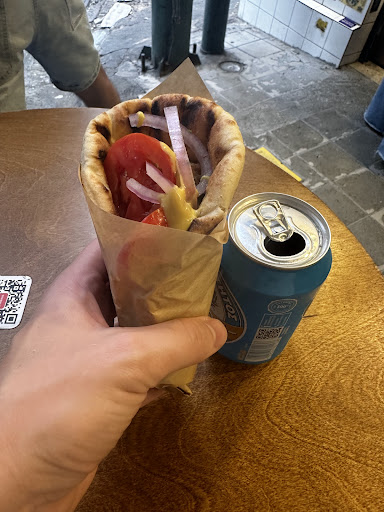 Read moreLocated at the end of one of Varvakios Market's ample lanes, this "fast food" (in the literal sense) place is paradise for the time-strapped or swift-footed. Indeed, for less than 3 euros and a minute of your time, you can get a small but honourably-filled "souvlaki in pita"; you can choose between chicken or pork for the meat, to which are added some vegetables, mustard and chili flakes (no tzatziki or fries !!). Drinks ranging from coke to beer, as well as regular souvlakis (ie meat skewers) are also on sale. The sitting area is as you'd expect; raw and practical, with a few stools for sitting and barrels for tables. The owner spoke English, seemed a rather jocular fellow and delivered the pita faster than I could...