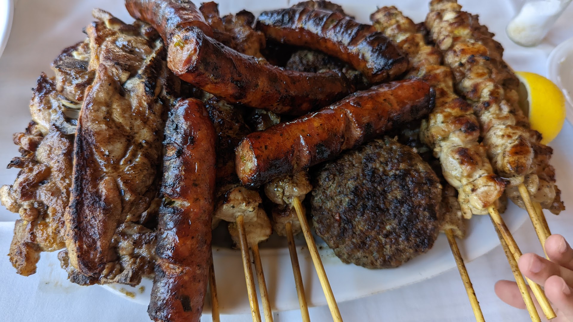 We ordered a mixed meat platter for five people and we were given five of everything, so pork Souvlaki, chicken Souvlaki, lamb chops, loukaniko and Bifteki. Meat was cooked beautifully with wonderful flavour.